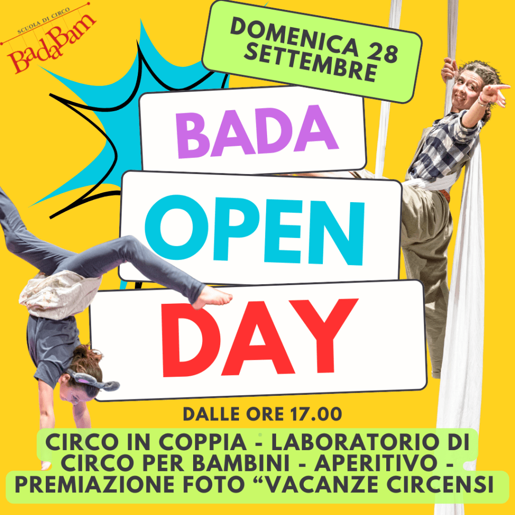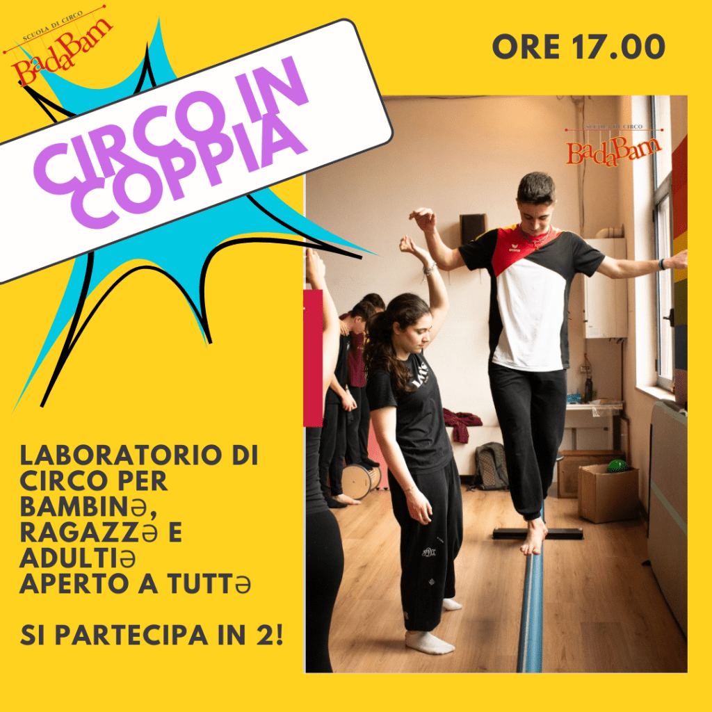 ore 17.00 CIRCO IN COPPIA, allievi e allieve di Badabam potranno partecipare insieme a una persona a loro scelta: genitori e figli, fratelli e sorelle, amici e compagni di scuola, altri familiari o figure di riferimento. Non servono esperienze pregresse, solo voglia di giocare, muoversi e scoprire insieme! Clicca qui per saperne di più.