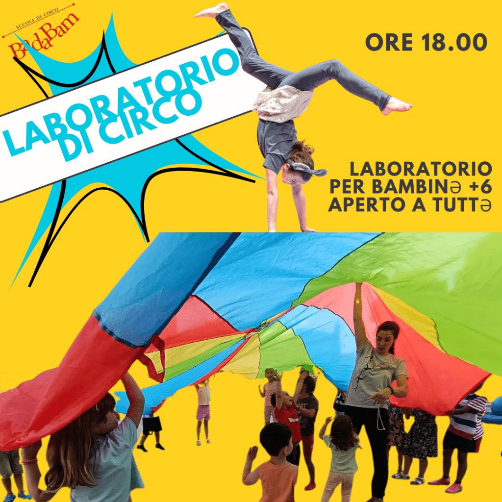ore 18.00 LABORATORIO DI CIRCO +6, i partecipanti potranno provare e sperimentare tutti gli attrezzi circensi, come la giocoleria, l’equilibrismo, il trapezio, il tessuto aereo e molto altro attraverso giochi e proposte guidate dal nostro Team.