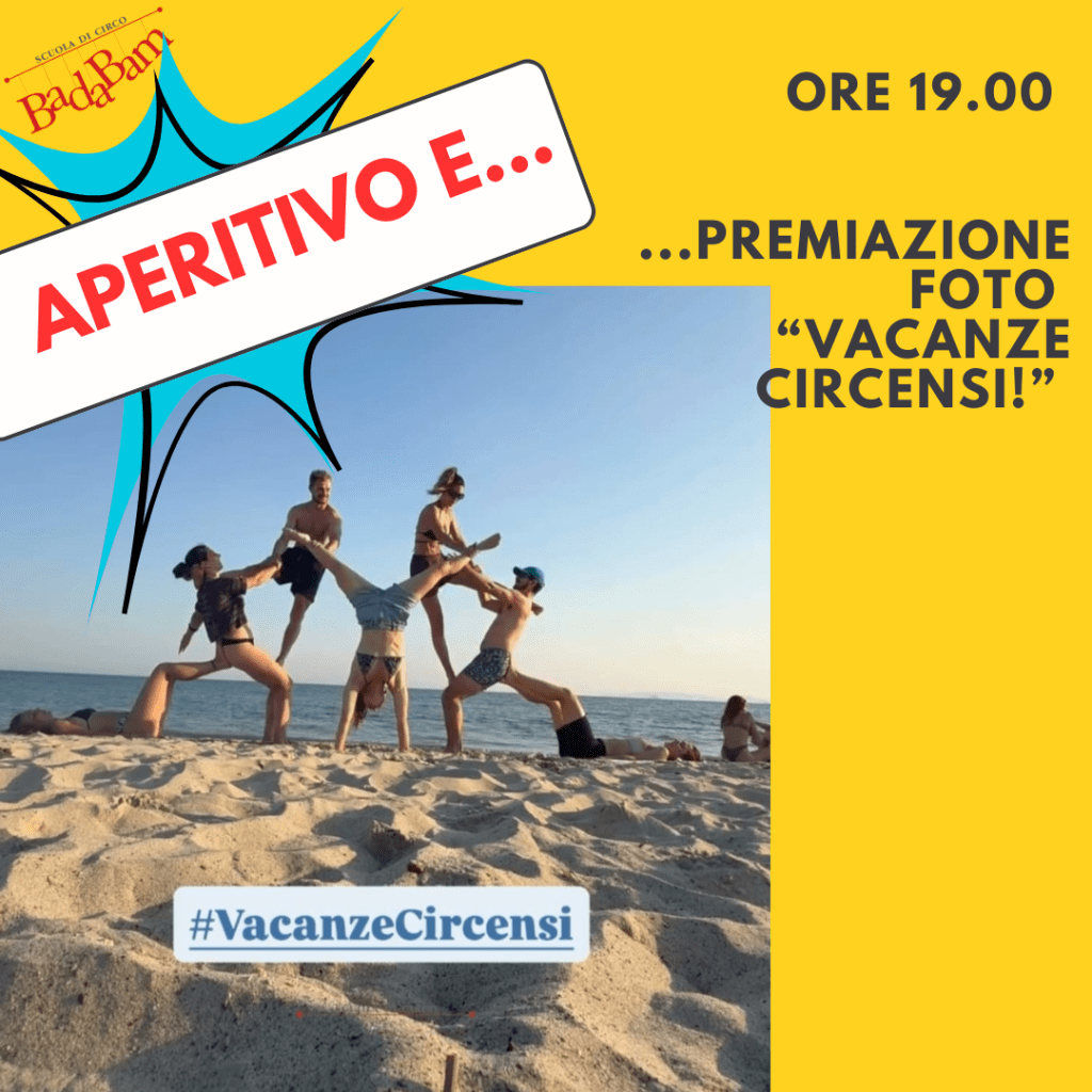 ore 19.15 PREMIAZIONE FOTO “VACANZE CIRCENSI” E APERITIVO. Il Contest dell’estate è ormai giunto alla fine, scopriremo chi saranno i fortunati ad aggiudicarsi il premio giuria, un mese gratuito e il premio pubblico, un gadget Badabam.